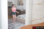 Mercedes Mac seduces stepson David Lee in pink bra and denim shorts, dropping to knees for sloppy oral on his big cock. She masturbates with black vibrator, then they fuck missionary, doggy, reverse cowgirl—panties to the side, no bra real boobs bouncing. David eats her pussy, she deepthroats him, prone pounding her tight hole. Straddling rides lead to intense creampie, cum dripping from her filled pussy. Braids, dark nails, blue necklace accent raw Spy Fam taboo sex with cumshot finish.