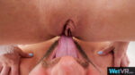 Petite brunette Rose Caarter starts in pink choker and white thigh-high socks, kneeling nude to slurp erect cock with tongue out, blue nails…